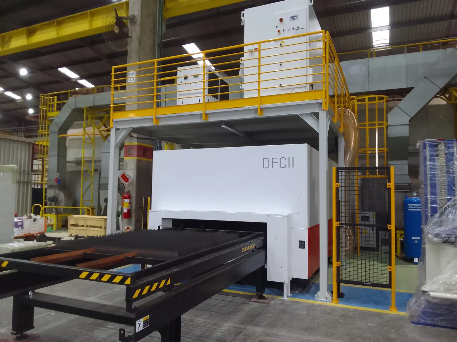 Mezanino metálico desenvolvido para a área de máquina de corte a laser, permitindo a instalação de equipamentos auxiliares na parte superior da estrutura. A solução foi projetada para otimizar o layout da produção, liberar espaço no piso e melhorar a organização dos equipamentos, garantindo maior eficiência operacional e melhor aproveitamento da área produtiva.