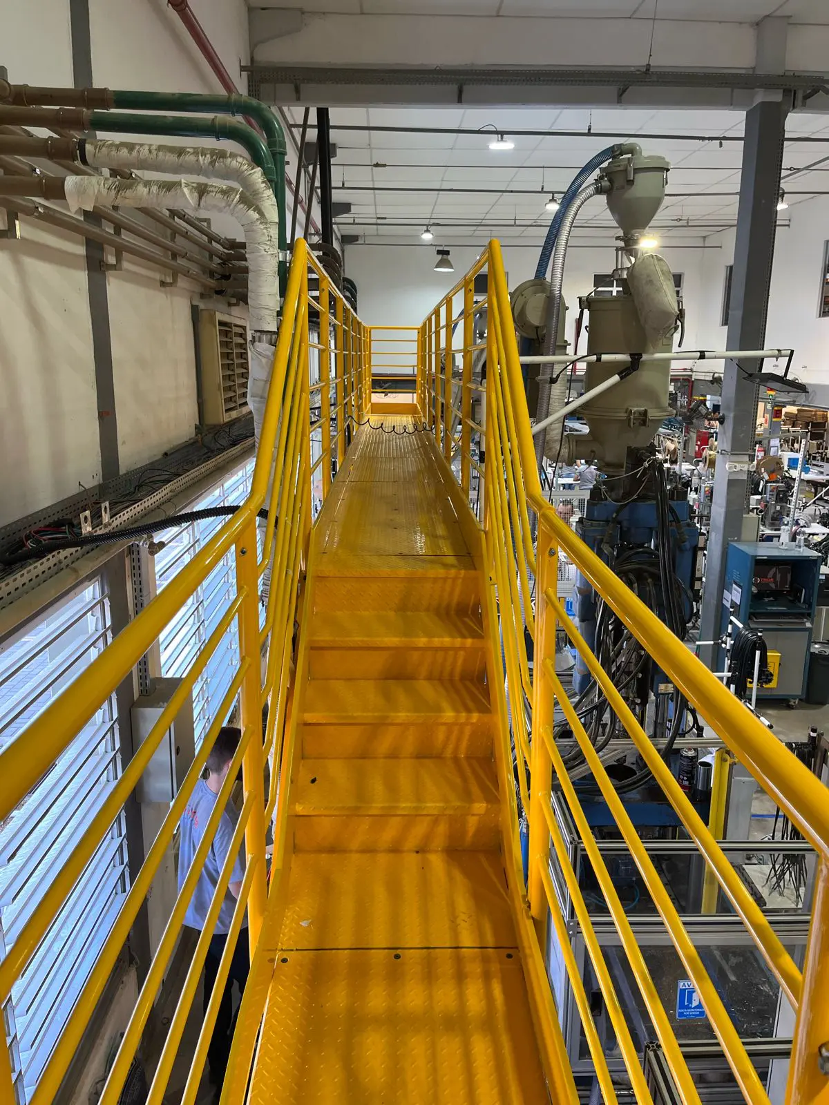 Plataforma metálica desenvolvida para manutenção de máquinas injetoras, proporcionando acesso seguro e facilitando as atividades de manutenção e o abastecimento de matéria-prima. A estrutura foi projetada para melhorar a ergonomia e a eficiência das operações, sendo fabricada em conformidade com as normas técnicas aplicáveis.