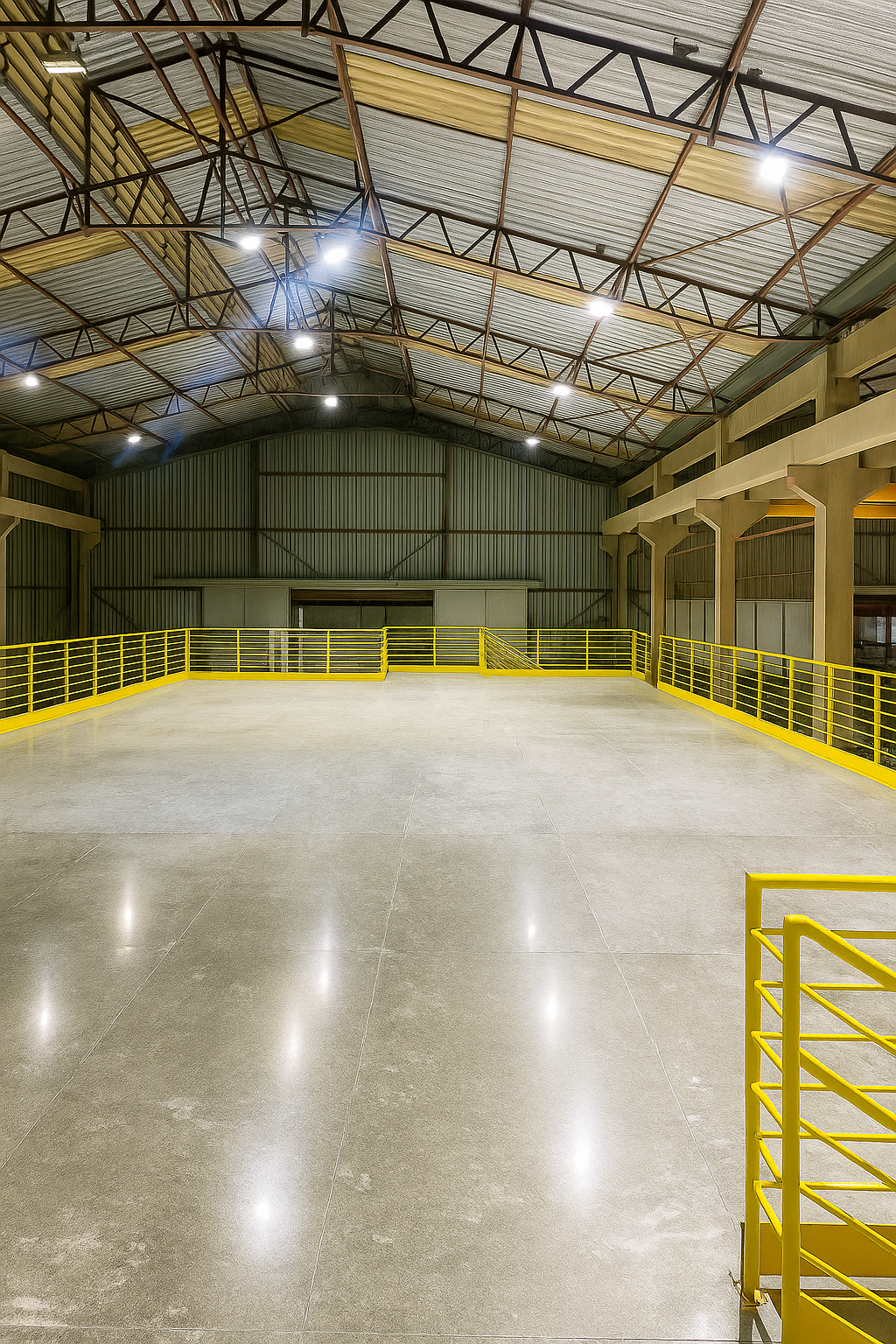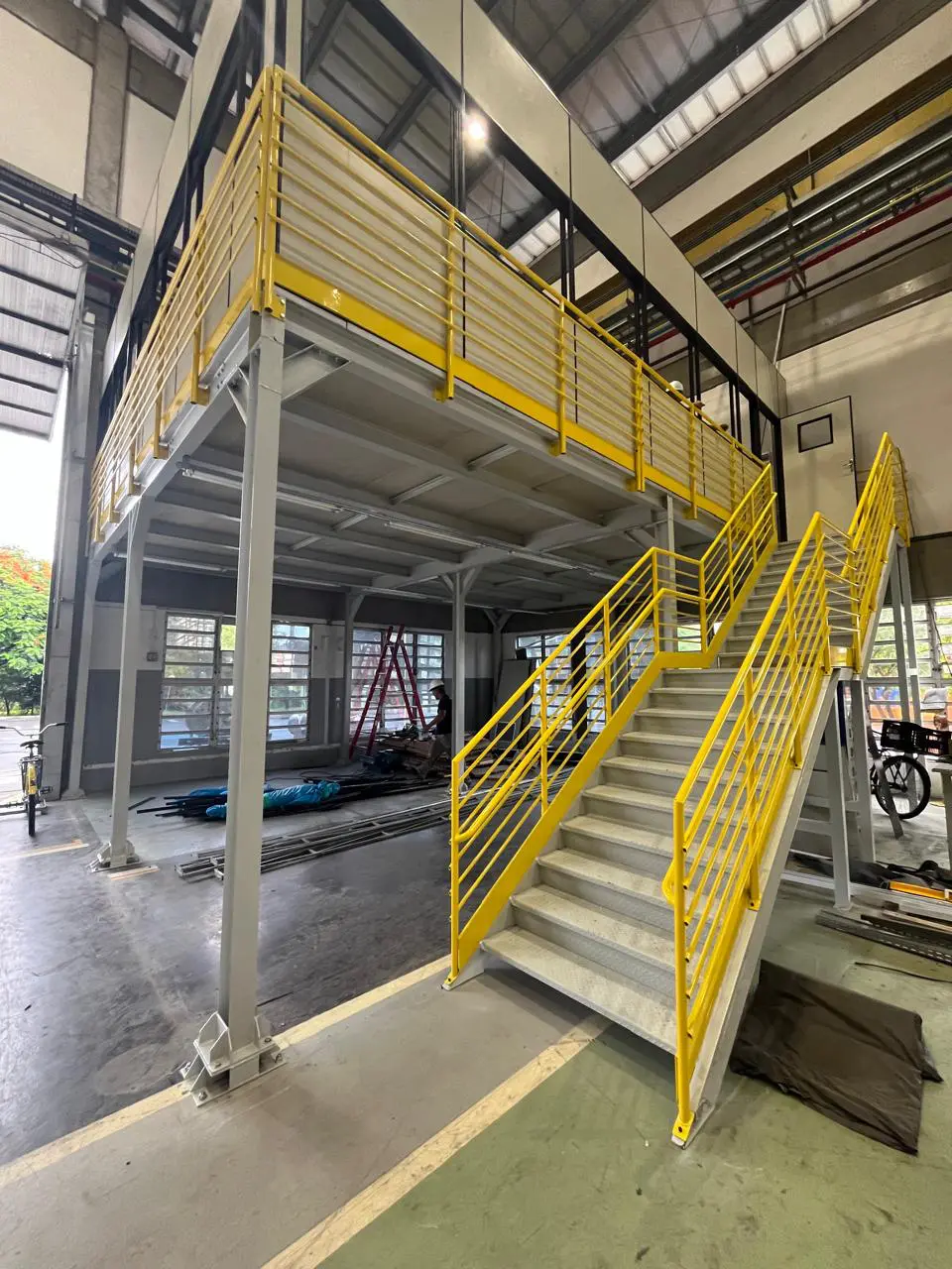 Mezanino metálico com 400 m² de área útil e capacidade de carga de 500 kg/m², projetado para ampliação e melhor aproveitamento do espaço produtivo. A estrutura conta com guarda-corpo perimetral para maior segurança e duas escadas metálicas de acesso.